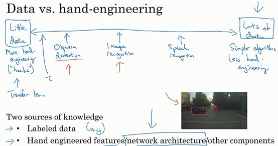 相反当你没有那么多的数据时,那时你会看到人们从事更多的是手工工程,低调点说就是你有很多小技巧可用(整理者注:在机器学习或者深度学习中,一般更崇尚更少的人工处理,而手工工程更多依赖人工处理,注意领会Andrew NG的意思)。但我认为每你没有太多数据时,手工工程实际上是获得良好表现的最佳方式。