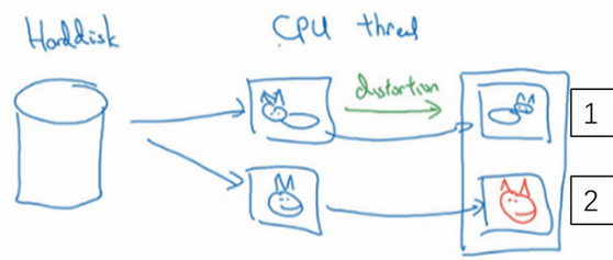但是你有特别大的训练数据,接下来这些就是人么经常使用的方法。你可能会使用CPU线程,然后它不停的从硬盘中读取数据,所以你有一个从硬盘过来的图片数据流。你可以用CPU线程来实现这些失真变形,可以是随机裁剪、颜色变化,或者是镜像。但是对每张图片得到对应的某一种变形失真形式,看这张图片(编号1),对其进行镜像变换,以及使用颜色失真,这张图最后会颜色变化(编号2),从而得到不同颜色的猫。