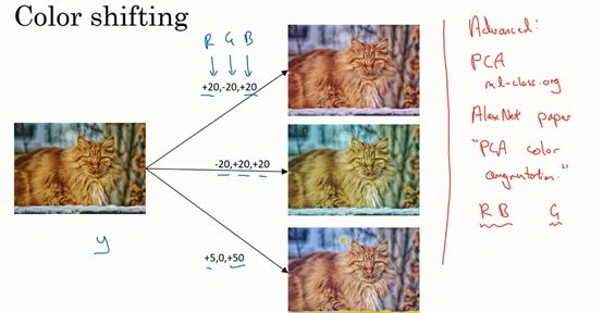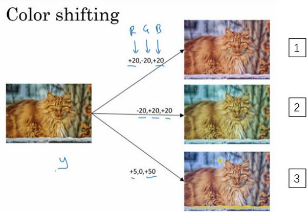 在这(编号3)使用了更多的蓝色,仅仅多了点红色。在实践中,R、G和B的值是根据某种概率分布来决定的。这么做的理由是,可能阳光会有一点偏黄,或者是灯光照明有一点偏黄,这些可以轻易的改变图像的颜色,但是对猫的识别,或者是内容的识别,以及标签,还是保持不变的。所以介绍这些,颜色失真或者是颜色变换方法,这样会使得你的学习算法对照片的颜色更改更具鲁棒性。