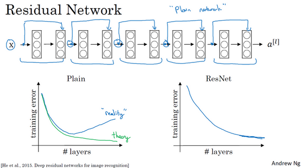 如果我们使用标准优化算法训练一个普通网络,比如说梯度下降法,或者其它热门的优化算法。如果没有残差,没有这些捷径或者跳跃连接,凭经验你会发现随着网络深度的加深,训练错误会先减少,然后增多。而理论上,随着网络深度的加深,应该训练得越来越好才对。也就是说,理论上网络深度越深越好。但实际上,如果没有残差网络,对于一个普通网络来说,深度越深意味着用优化算法越难训练。实际上,随着网络深度的加深,训练错误会越来越多。