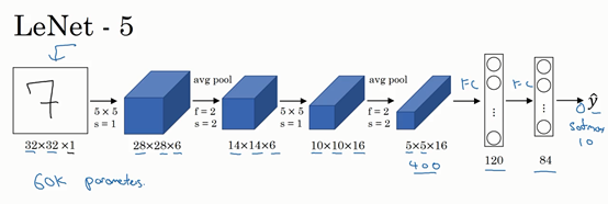 不管怎样,如果我们从左往右看,随着网络越来越深,图像的高度和宽度在缩小,从最初的32×32缩小到28×28,再到14×14、10×10,最后只有5×5。与此同时,随着网络层次的加深,通道数量一直在增加,从1增加到6个,再到16个。