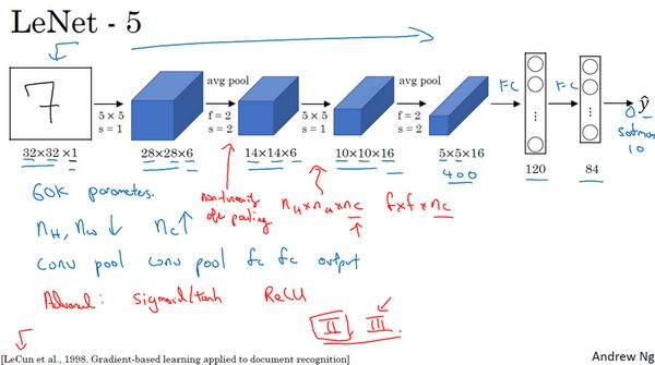 相比现代版本,这里得到的神经网络会小一些,只有约6万个参数。而现在,我们经常看到含有一千万到一亿个参数的神经网络,比这大1000倍的神经网络也不在少数。