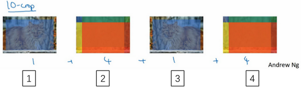 这是这里(编号1)和这里(编号3)就是中心crop,这里(编号2)和这里(编号4)就是四个角落的crop。如果把这些加起来,就会有10种不同的图像的crop,因此命名为10-crop。所以你要做的就是,通过你的分类器来运行这十张图片,然后对结果进行平均。如果你有足够的计算预算,你可以这么做,也许他们需要10个crops,你可以使用更多,这可能会让你在生产系统中获得更好的性能。如果是生产的话,我的意思还是实际部署用户的系统。但这是另一种技术,它在基准测试上的应用,要比实际生产系统中好得多。
