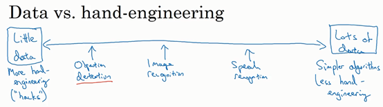 所以,观察一下机器学习数据范围图谱,你会发现当你有很多数据时,人们倾向于使用更简单的算法和更少的手工工程,因为我们不需要为这个问题精心设计特征。当你有大量的数据时,只要有一个大型的神经网络,甚至一个更简单的架构,可以是一个神经网络,就可以去学习它想学习的东西。