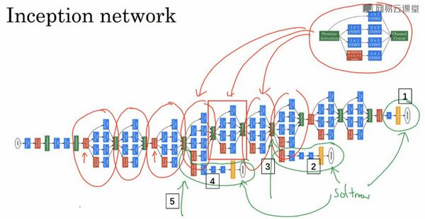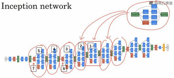 这是一张取自Szegety et al的论文中关于Inception网络的图片,你会发现图中有许多重复的模块,可能整张图看上去很复杂,但如果你只截取其中一个环节(编号1),就会发现这是在前一页ppt中所见的Inception模块。