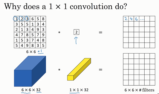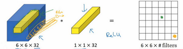 如果是一张6×6×32的图片,那么使用1×1过滤器进行卷积效果更好。具体来说,1×1卷积所实现的功能是遍历这36个单元格,计算左图中32个数字和过滤器中32个数字的元素积之和,然后应用ReLU非线性函数。