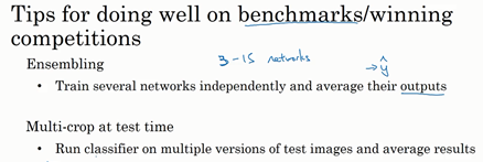 其中一个是集成,这就意味着在你想好了你想要的神经网络之后,可以独立训练几个神经网络,并平均它们的输出。比如说随机初始化三个、五个或者七个神经网络,然后训练所有这些网络,然后平均它们的输出。另外对他们的输出进行平均计算是很重要的,不要平均他们的权重,这是行不通的。看看你的7个神经网络,它们有7个不同的预测,然后平均他们,这可能会让你在基准上提高1%,2%或者更好。这会让你做得更好,也许有时会达到1%或2%,这真的能帮助你赢得比赛。但因为集成意味着要对每张图片进行测试,你可能需要在从3到15个不同的网络中运行一个图像,这是很典型的,因为这3到15个网络可能会让你的运行时间变慢,甚至更多时间,所以技巧之一的集成是人们在基准测试中表现出色和赢得比赛的利器,但我认为这几乎不用于生产服务于客户的,我想除非你有一个巨大的计算预算而且不介意在每个用户图像数据上花费大量的计算。
