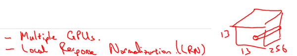 论文还提到,经典的AlexNet结构还有另一种类型的层,叫作“局部响应归一化层”(Local Response Normalization),即LRN层,这类层应用得并不多,所以我并没有专门讲。局部响应归一层的基本思路是,假如这是网络的一块,比如是13×13×256,LRN要做的就是选取一个位置,比如说这样一个位置,从这个位置穿过整个通道,能得到256个数字,并进行归一化。进行局部响应归一化的动机是,对于这张13×13的图像中的每个位置来说,我们可能并不需要太多的高激活神经元。但是后来,很多研究者发现LRN起不到太大作用,这应该是被我划掉的内容之一,因为并不重要,而且我们现在并不用LRN来训练网络。
