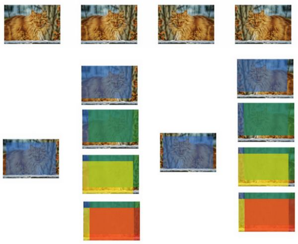 举个例子,让我们看看猫的图片,然后把它复制四遍,包括它的两个镜像版本。有一种叫作10-crop的技术(crop理解为裁剪的意思),它基本上说,假设你取这个中心区域,裁剪,然后通过你的分类器去运行它,然后取左上角区域,运行你的分类器,右上角用绿色表示,左下方用黄色表示,右下方用橙色表示,通过你的分类器来运行它,然后对镜像图像做同样的事情对吧?所以取中心的crop,然后取四个角落的crop。