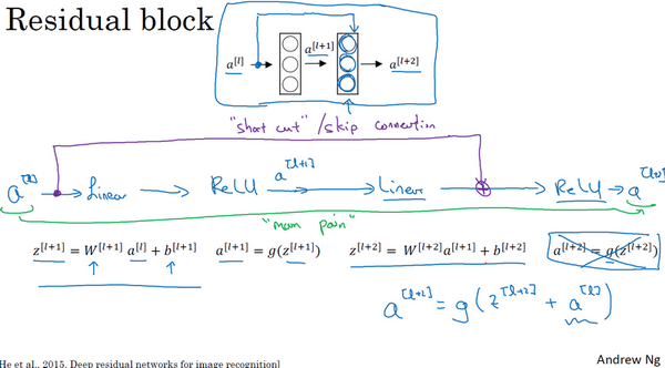 在上面这个图中,我们也可以画一条捷径,直达第二层。实际上这条捷径是在进行ReLU非线性激活函数之前加上的,而这里的每一个节点都执行了线性函数和ReLU激活函数。所以插入的时机是在线性激活之后,ReLU激活之前。除了捷径,你还会听到另一个术语“跳跃连接”,就是指跳过一层或者好几层,从而将信息传递到神经网络的更深层。