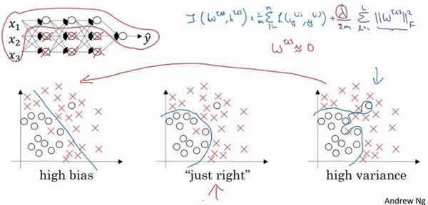 直观上理解就是如果正则化设置得足够大,权重矩阵被设置为接近于0的值,直观理解就是把多隐藏单元的权重设为0,于是基本上消除了这些隐藏单元的许多影响。如果是这种情况,这个被大大简化了的神经网络会变成一个很小的网络,小到如同一个逻辑回归单元,可是深度却很大,它会使这个网络从过度拟合的状态更接近左图的高偏差状态。