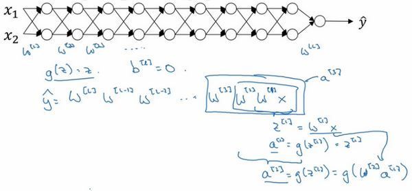 相反的,如果权重是0.5,,它比1小,这项也就变成了,矩阵,再次忽略,因此每个矩阵都小于1,假设和都是1,激活函数将变成,,,,,等,直到最后一项变成,所以作为自定义函数,激活函数的值将以指数级下降,它是与网络层数数量相关的函数,在深度网络中,激活函数以指数级递减。
