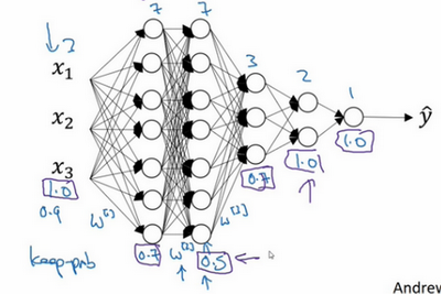 实施dropout的另一个细节是,这是一个拥有三个输入特征的网络,其中一个要选择的参数是keep-prob,它代表每一层上保留单元的概率。所以不同层的keep-prob也可以变化。第一层,矩阵是7×3,第二个权重矩阵是7×7,第三个权重矩阵是3×7,以此类推,是最大的权重矩阵,因为拥有最大参数集,即7×7,为了预防矩阵的过拟合,对于这一层,我认为这是第二层,它的keep-prob值应该相对较低,假设是0.5。对于其它层,过拟合的程度可能没那么严重,它们的keep-prob值可能高一些,可能是0.7,这里是0.7。如果在某一层,我们不必担心其过拟合的问题,那么keep-prob可以为1,为了表达清除,我用紫色线笔把它们圈出来,每层keep-prob的值可能不同。