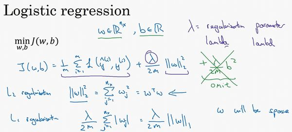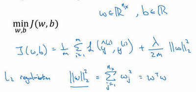 如果你怀疑神经网络过度拟合了数据,即存在高方差问题,那么最先想到的方法可能是正则化,另一个解决高方差的方法就是准备更多数据,这也是非常可靠的办法,但你可能无法时时准备足够多的训练数据,或者,获取更多数据的成本很高,但正则化有助于避免过度拟合,或者减少网络误差,下面我们就来讲讲正则化的作用原理。