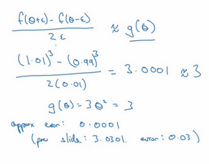 我们写一下数据算式,图中绿色三角形上边的点的值是,下边的点是,这个三角形的高度是,这两个宽度都是ε,所以三角形的宽度是,高宽比值为,它的期望值接近,传入参数值,,大家可以暂停视频,用计算器算算结果,结果应该是3.0001,而前面一张幻灯片上面是,当时,,所以这两个值非常接近,逼近误差为0.0001,前一张幻灯片,我们只考虑了单边公差,即从到之间的误差,的值为3.0301,逼近误差是0.03,不是0.0001,所以使用双边误差的方法更逼近导数,其结果接近于3,现在我们更加确信,可能是导数的正确实现,在梯度检验和反向传播中使用该方法时,最终,它与运行两次单边公差的速度一样,实际上,我认为这种方法还是非常值得使用的,因为它的结果更准确。