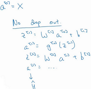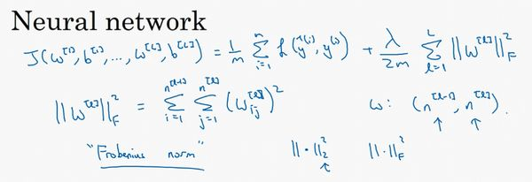 现在我们来看下这个庞大的深度拟合神经网络。我知道这张图不够大,深度也不够,但你可以想象这是一个过拟合的神经网络。这是我们的代价函数,含有参数,。我们添加正则项,它可以避免数据权值矩阵过大,这就是弗罗贝尼乌斯范数,为什么压缩范数,或者弗罗贝尼乌斯范数或者参数可以减少过拟合?