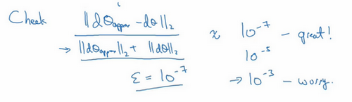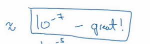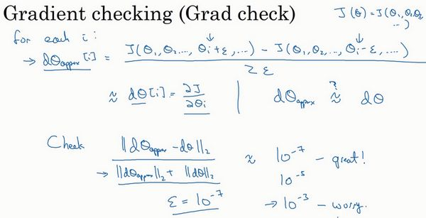 如果左边这个方程式结果是,我就会担心是否存在bug,计算结果应该比小很多,如果比大很多,我就会很担心,担心是否存在bug。这时应该仔细检查所有项,看是否有一个具体的值,使得与大不相同,并用它来追踪一些求导计算是否正确,经过一些调试,最终结果会是这种非常小的值(),那么,你的实施可能是正确的。