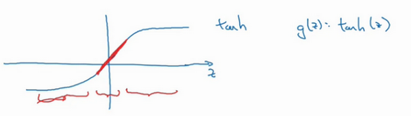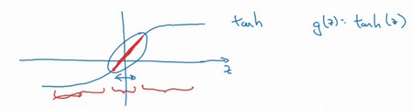 用表示,我们发现如果 z 非常小,比如 z 只涉及很小范围的参数(图中原点附近的红色区域),这里我们利用了双曲正切函数的线性状态,只要可以扩展为这样的更大值或者更小值,激活函数开始变得非线性。