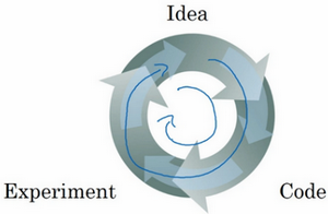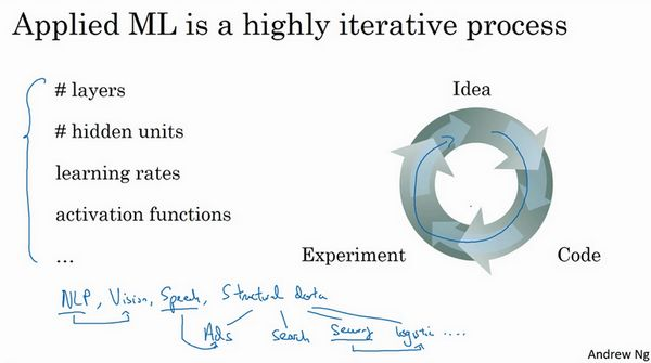 创建新应用的过程中,我们不可能从一开始就准确预测出这些信息和其他超级参数。实际上,应用型机器学习是一个高度迭代的过程,通常在项目启动时,我们会先有一个初步想法,比如构建一个含有特定层数,隐藏单元数量或数据集个数等等的神经网络,然后编码,并尝试运行这些代码,通过运行和测试得到该神经网络或这些配置信息的运行结果,你可能会根据输出结果重新完善自己的想法,改变策略,或者为了找到更好的神经网络不断迭代更新自己的方案。