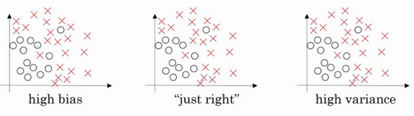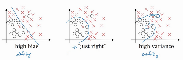 左图是高偏差,右图是高方差,中间是Just Right,这几张图我们在前面课程中看到过。