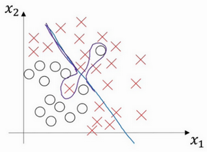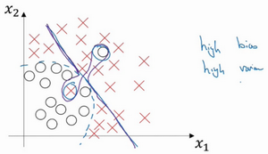 但是如果我们稍微改变一下分类器,我用紫色笔画出,它会过度拟合部分数据,用紫色线画出的分类器具有高偏差和高方差,偏差高是因为它几乎是一条线性分类器,并未拟合数据。