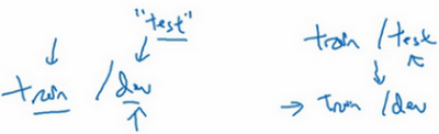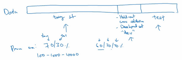 假设这是训练数据,我用一个长方形表示,我们通常会将这些数据划分成几部分,一部分作为训练集,一部分作为简单交叉验证集,有时也称之为验证集,方便起见,我就叫它验证集(dev set),其实都是同一个概念,最后一部分则作为测试集。