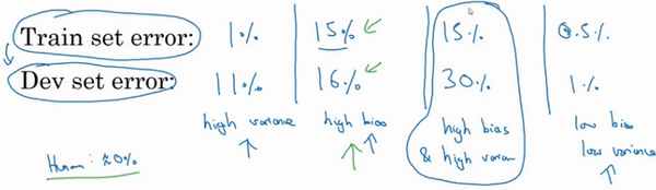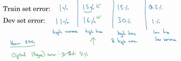 有一点我先在这个简单提一下,具体的留在后面课程里讲,这些分析都是基于假设预测的,假设人眼辨别的错误率接近0%,一般来说,最优误差也被称为贝叶斯误差,所以,最优误差接近0%,我就不在这里细讲了,如果最优误差或贝叶斯误差非常高,比如15%。我们再看看这个分类器(训练误差15%,验证误差16%),15%的错误率对训练集来说也是非常合理的,偏差不高,方差也非常低。