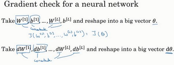 梯度检验帮我们节省了很多时间,也多次帮我发现backprop实施过程中的bug,接下来,我们看看如何利用它来调试或检验backprop的实施是否正确。