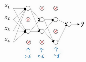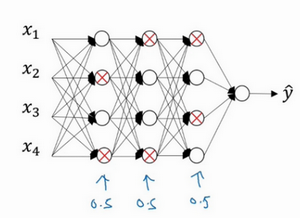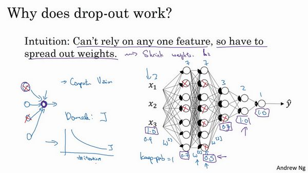 总结一下,如果你担心某些层比其它层更容易发生过拟合,可以把某些层的keep-prob值设置得比其它层更低,缺点是为了使用交叉验证,你要搜索更多的超级参数,另一种方案是在一些层上应用dropout,而有些层不用dropout,应用dropout的层只含有一个超级参数,就是keep-prob。
