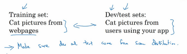 现代深度学习的另一个趋势是越来越多的人在训练和测试集分布不匹配的情况下进行训练,假设你要构建一个用户可以上传大量图片的应用程序,目的是找出并呈现所有猫咪图片,可能你的用户都是爱猫人士,训练集可能是从网上下载的猫咪图片,而验证集和测试集是用户在这个应用上上传的猫的图片,就是说,训练集可能是从网络上抓下来的图片。而验证集和测试集是用户上传的图片。结果许多网页上的猫咪图片分辨率很高,很专业,后期制作精良,而用户上传的照片可能是用手机随意拍摄的,像素低,比较模糊,这两类数据有所不同,针对这种情况,根据经验,我建议大家要确保验证集和测试集的数据来自同一分布,关于这个问题我也会多讲一些。因为你们要用验证集来评估不同的模型,尽可能地优化性能。如果验证集和测试集来自同一个分布就会很好。