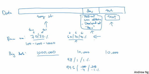 目前为止,我觉得,对于很多应用系统,即使是经验丰富的深度学习行家也不太可能一开始就预设出最匹配的超级参数,所以说,应用深度学习是一个典型的迭代过程,需要多次循环往复,才能为应用程序找到一个称心的神经网络,因此循环该过程的效率是决定项目进展速度的一个关键因素,而创建高质量的训练数据集,验证集和测试集也有助于提高循环效率。