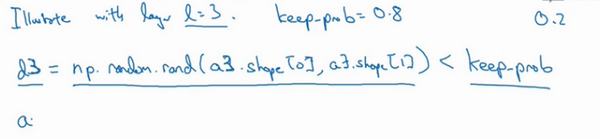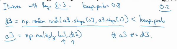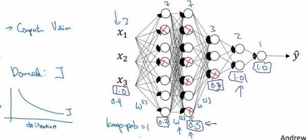 注意keep-prob的值是1,意味着保留所有单元,并且不在这一层使用dropout,对于有可能出现过拟合,且含有诸多参数的层,我们可以把keep-prob设置成比较小的值,以便应用更强大的dropout,有点像在处理正则化的正则化参数,我们尝试对某些层施行更多正则化,从技术上讲,我们也可以对输入层应用dropout,我们有机会删除一个或多个输入特征,虽然现实中我们通常不这么做,keep-prob的值为1,是非常常用的输入值,也可以用更大的值,或许是0.9。但是消除一半的输入特征是不太可能的,如果我们遵守这个准则,keep-prob会接近于1,即使你对输入层应用dropout。