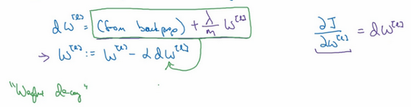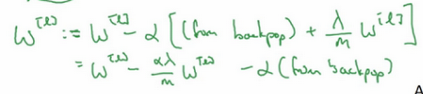 这就是之前我们额外增加的正则化项,既然已经增加了这个正则项,现在我们要做的就是给加上这一项,然后计算这个更新项,使用新定义的,它的定义含有相关参数代价函数导数和,以及最后添加的额外正则项,这也是正则化有时被称为“权重衰减”的原因。