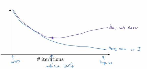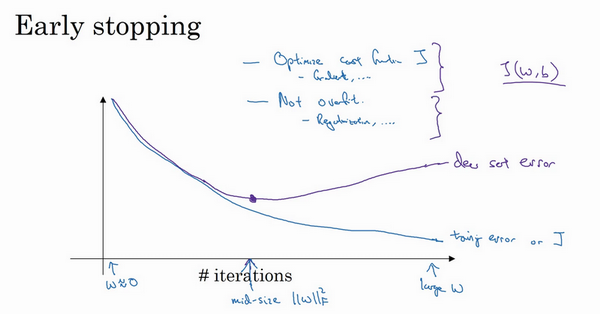 当你还未在神经网络上运行太多迭代过程的时候,参数接近0,因为随机初始化值时,它的值可能都是较小的随机值,所以在你长期训练神经网络之前依然很小,在迭代过程和训练过程中的值会变得越来越大,比如在这儿,神经网络中参数的值已经非常大了,所以early stopping要做就是在中间点停止迭代过程,我们得到一个值中等大小的弗罗贝尼乌斯范数,与正则化相似,选择参数w范数较小的神经网络,但愿你的神经网络过度拟合不严重。