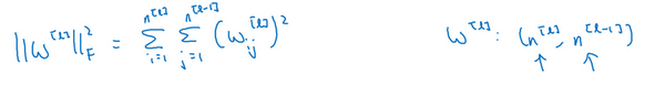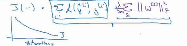 神经网络含有一个成本函数,该函数包含,到,所有参数,字母是神经网络所含的层数,因此成本函数等于个训练样本损失函数的总和乘以,正则项为,我们称为范数平方,这个矩阵范数(即平方范数),被定义为矩阵中所有元素的平方求和,