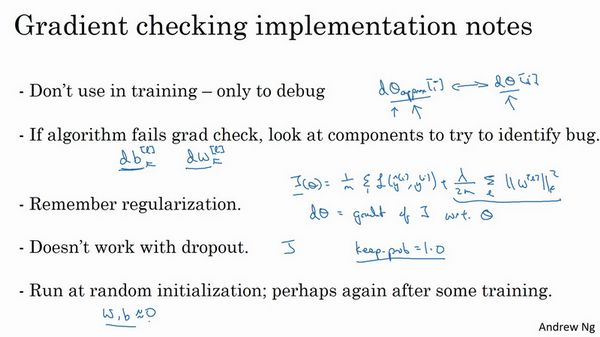 第二点,如果算法的梯度检验失败,要检查所有项,检查每一项,并试着找出bug,也就是说,如果与dθ[i]的值相差很大,我们要做的就是查找不同的i值,看看是哪个导致与的值相差这么多。举个例子,如果你发现,相对某些层或某层的或的值相差很大,但是的各项非常接近,注意的各项与和的各项都是一一对应的,这时,你可能会发现,在计算参数的导数的过程中存在bug。反过来也是一样,如果你发现它们的值相差很大,的值与的值相差很大,你会发现所有这些项目都来自于或某层的,可能帮你定位bug的位置,虽然未必能够帮你准确定位bug的位置,但它可以帮助你估测需要在哪些地方追踪bug。