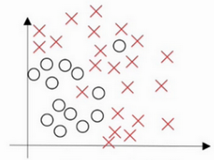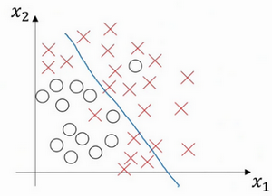 假设这就是数据集,如果给这个数据集拟合一条直线,可能得到一个逻辑回归拟合,但它并不能很好地拟合该数据,这是高偏差(high bias)的情况,我们称为“欠拟合”(underfitting)。