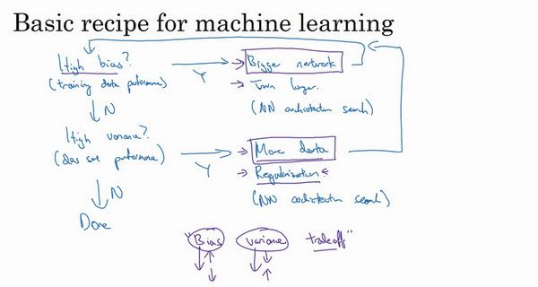 这是我在训练神经网络时用到的基本方法,初始模型训练完成后,我首先要知道算法的偏差高不高,如果偏差较高,试着评估训练集或训练数据的性能。如果偏差的确很高,甚至无法拟合训练集,那么你要做的就是选择一个新的网络,比如含有更多隐藏层或者隐藏单元的网络,或者花费更多时间来训练网络,或者尝试更先进的优化算法,后面我们会讲到这部分内容。你也可以尝试其他方法,可能有用,也可能没用。