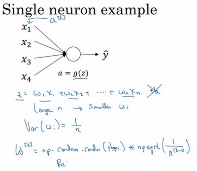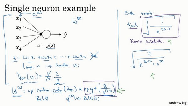 ,,暂时忽略,为了预防值过大或过小,你可以看到越大,你希望越小,因为是的和,如果你把很多此类项相加,希望每项值更小,最合理的方法就是设置,表示神经元的输入特征数量,实际上,你要做的就是设置某层权重矩阵,就是我喂给第层神经单元的数量(即第层神经元数量)。