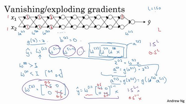 假设每个权重矩阵,从技术上来讲,最后一项有不同维度,可能它就是余下的权重矩阵,,因为我们假设所有矩阵都等于它,它是1.5倍的单位矩阵,最后的计算结果就是,也就是等于。如果对于一个深度神经网络来说值较大,那么的值也会非常大,实际上它呈指数级增长的,它增长的比率是,因此对于一个深度神经网络,的值将爆炸式增长。
