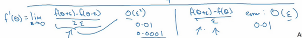 对于一个非零的,它的逼近误差可以写成,ε值非常小,如果,,大写符号的含义是指逼近误差其实是一些常量乘以,但它的确是很准确的逼近误差,所以大写的常量有时是1。然而,如果我们用另外一个公式逼近误差就是,当小于1时,实际上比大很多,所以这个公式近似值远没有左边公式的准确,所以在执行梯度检验时,我们使用双边误差,即,而不使用单边公差,因为它不够准确。