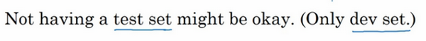 在机器学习中,如果只有一个训练集和一个验证集,而没有独立的测试集,遇到这种情况,训练集还被人们称为训练集,而验证集则被称为测试集,不过在实际应用中,人们只是把测试集当成简单交叉验证集使用,并没有完全实现该术语的功能,因为他们把验证集数据过度拟合到了测试集中。如果某团队跟你说他们只设置了一个训练集和一个测试集,我会很谨慎,心想他们是不是真的有训练验证集,因为他们把验证集数据过度拟合到了测试集中,让这些团队改变叫法,改称其为“训练验证集”,而不是“训练测试集”,可能不太容易。即便我认为“训练验证集“在专业用词上更准确。实际上,如果你不需要无偏评估算法性能,那么这样是可以的。