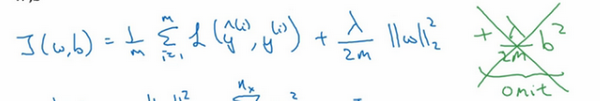 为什么只正则化参数?为什么不再加上参数 呢?你可以这么做,只是我习惯省略不写,因为通常是一个高维参数矢量,已经可以表达高偏差问题,可能包含有很多参数,我们不可能拟合所有参数,而只是单个数字,所以几乎涵盖所有参数,而不是,如果加了参数,其实也没太大影响,因为只是众多参数中的一个,所以我通常省略不计,如果你想加上这个参数,完全没问题。