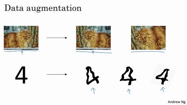 假设你正在拟合猫咪图片分类器,如果你想通过扩增训练数据来解决过拟合,但扩增数据代价高,而且有时候我们无法扩增数据,但我们可以通过添加这类图片来增加训练集。例如,水平翻转图片,并把它添加到训练集。所以现在训练集中有原图,还有翻转后的这张图片,所以通过水平翻转图片,训练集则可以增大一倍,因为训练集有冗余,这虽然不如我们额外收集一组新图片那么好,但这样做节省了获取更多猫咪图片的花费。