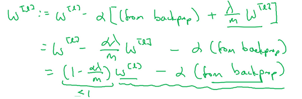 该正则项说明,不论是什么,我们都试图让它变得更小,实际上,相当于我们给矩阵W乘以倍的权重,矩阵减去倍的它,也就是用这个系数乘以矩阵,该系数小于1,因此范数正则化也被称为“权重衰减”,因为它就像一般的梯度下降,被更新为少了乘以backprop输出的最初梯度值,同时也乘以了这个系数,这个系数小于1,因此正则化也被称为“权重衰减”。