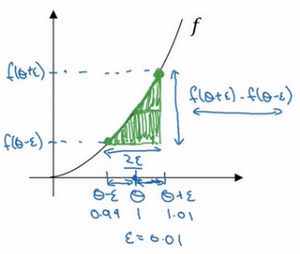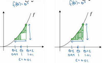 我们先画出函数,标记为,,先看一下的值,假设,不增大的值,而是在 右侧,设置一个,在左侧,设置。因此,,,跟以前一样,的值为0.01,看下这个小三角形,计算高和宽的比值,就是更准确的梯度预估,选择函数在上的这个点,用这个较大三角形的高比上宽,技术上的原因我就不详细解释了,较大三角形的高宽比值更接近于的导数,把右上角的三角形下移,好像有了两个三角形,右上角有一个,左下角有一个,我们通过这个绿色大三角形同时考虑了这两个小三角形。所以我们得到的不是一个单边公差而是一个双边公差。