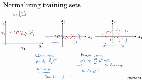 训练神经网络,其中一个加速训练的方法就是归一化输入。假设一个训练集有两个特征,输入特征为2维,归一化需要两个步骤: