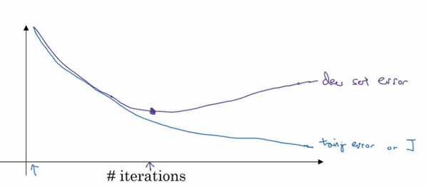 因为在训练过程中,我们希望训练误差,代价函数都在下降,通过early stopping,我们不但可以绘制上面这些内容,还可以绘制验证集误差,它可以是验证集上的分类误差,或验证集上的代价函数,逻辑损失和对数损失等,你会发现,验证集误差通常会先呈下降趋势,然后在某个节点处开始上升,early stopping的作用是,你会说,神经网络已经在这个迭代过程中表现得很好了,我们在此停止训练吧,得到验证集误差,它是怎么发挥作用的?