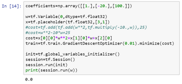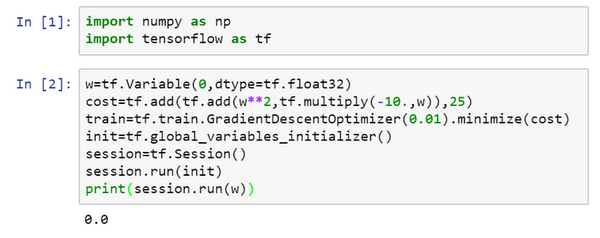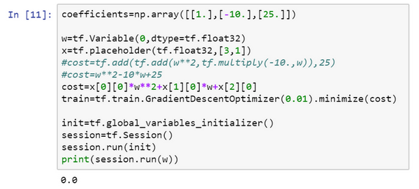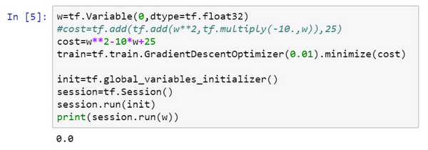 #接下来,让我们定义参数w,在TensorFlow中,你要用tf.Variable()来定义参数#然后我们定义损失函数:cost = tf.add(tf.add(w**2,tf.multiply(- 10.,w)),25)