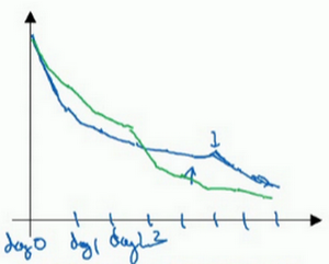 所以这两种方式的选择,是由你拥有的计算资源决定的,如果你拥有足够的计算机去平行试验许多模型,那绝对采用鱼子酱方式,尝试许多不同的超参数,看效果怎么样。但在一些应用领域,比如在线广告设置和计算机视觉应用领域,那里的数据太多了,你需要试验大量的模型,所以同时试验大量的模型是很困难的,它的确是依赖于应用的过程。但我看到那些应用熊猫方式多一些的组织,那里,你会像对婴儿一样照看一个模型,调试参数,试着让它工作运转。尽管,当然,甚至是在熊猫方式中,试验一个模型,观察它工作与否,也许第二或第三个星期后,也许我应该建立一个不同的模型(绿色曲线),像熊猫那样照料它,我猜,这样一生中可以培育几个孩子,即使它们一次只有一个孩子或孩子的数量很少。